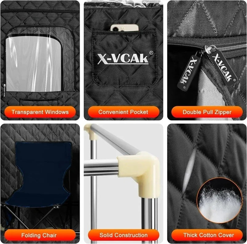 Med en generøs størrelse på 180 x 80 x 80 cm, gir denne dampbadstuen god plass til både sittende og stående bruk. Den medfølgende vanntette, sammenleggbare stolen sørger for optimal komfort under hele økten.